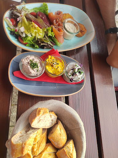 Außengastronomie sowohl vor dem Restaurant (mit Blick auf den Herderplatz) als auch im Biergarten, Bedienung und Küche sehr gut, sehr positiv: Kindergerichte sind aus mehreren Angeboten kombinierbar.